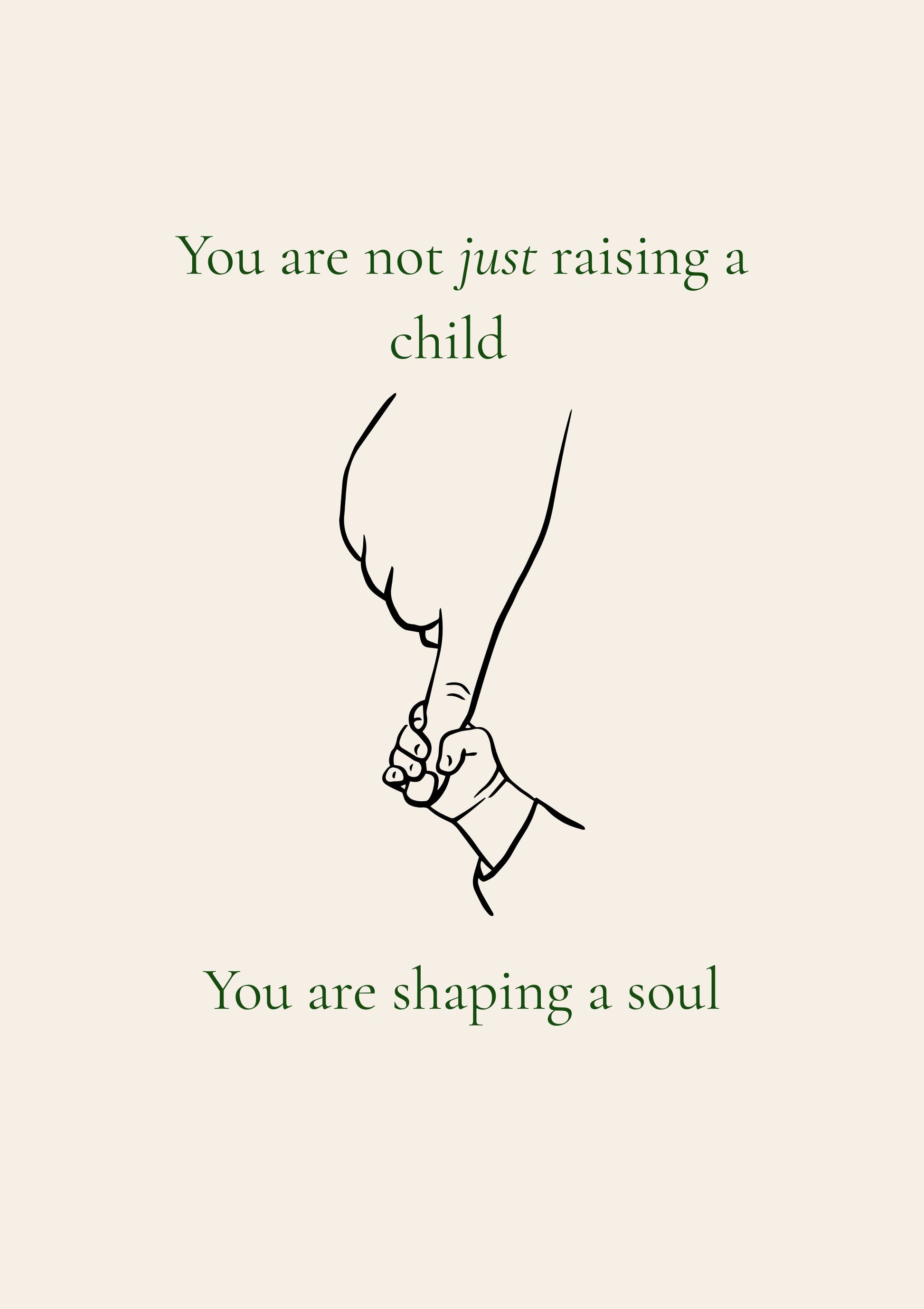 Encourage and uplift the heart of parenting with this “You Are Not Just Raising a Child, You Are Shaping a Soul” printable wall art. Featuring clean typography in forest green and a touching line illustration of a child holding a parent’s hand, this minimalist design speaks to the sacred weight of raising children in faith and love.